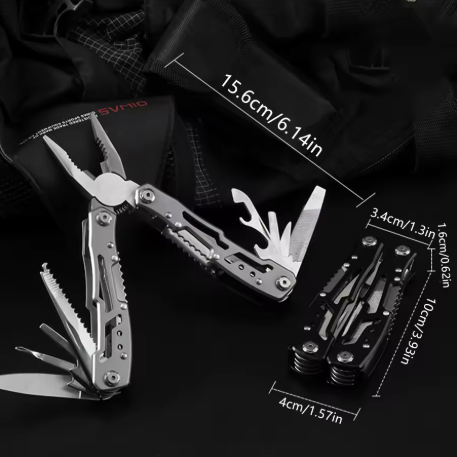 🛠️ 10-in-1 Multi Tool Design – Includes pliers, saw, wrenches, bottle & can openers, screwdrivers, wire cutters,, and more.