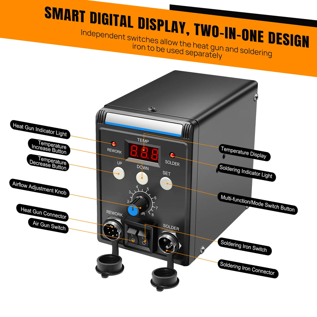 Built with advanced PID temperature control technology and an internal double-sided SMT process, this station delivers stable heat output and precise adjustments across a wide working range of 100°C to 500°C. The large LCD digital display provides real-time temperature monitoring, helping you work confidently with different materials and components.